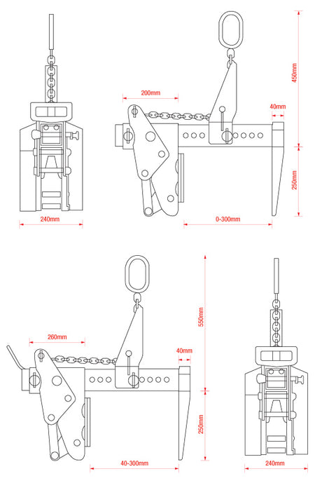 The 1500kg capacity model has a clamp range of 0-300mm (11.8 inches) whereas the 3 tonne capacity version's range is 40-300mm.